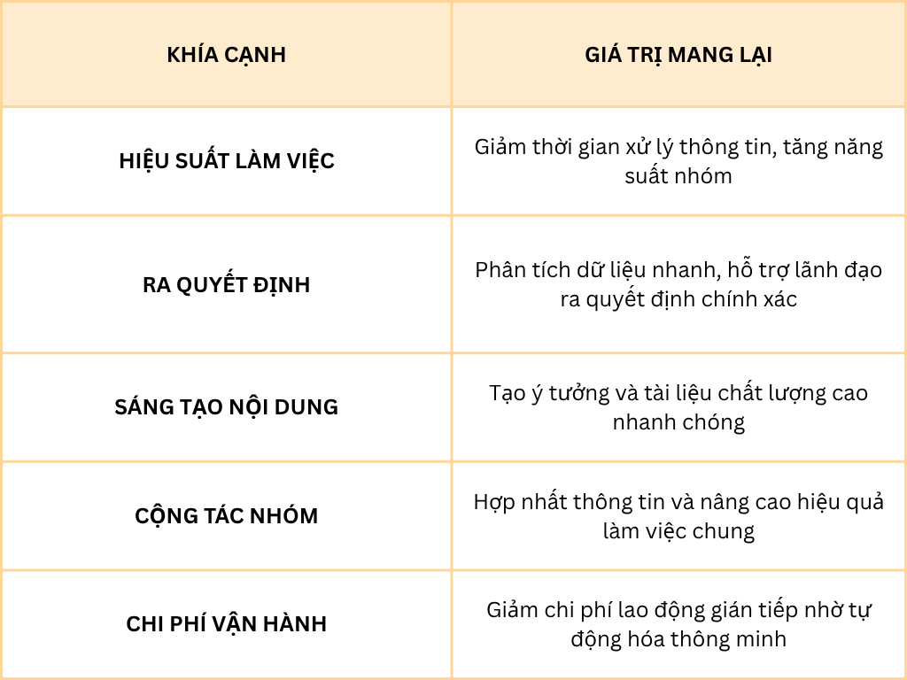 Ví dụ: phòng marketing có thể tạo bản nháp đề xuất chiến dịch trong vài phút thay vì vài giờ.